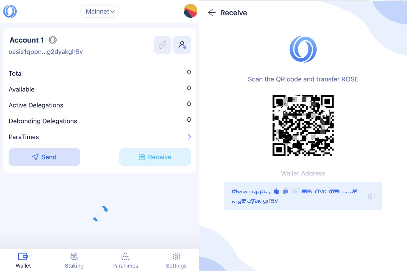 Step 2. Once done, you can deposit your ROSE to Emerald ParaTime. Navigate to the “ParaTimes” tab and click the “Receive” button. Then scan the QR code or copy the wallet address to deposit your ROSE to Emerald ParaTime.