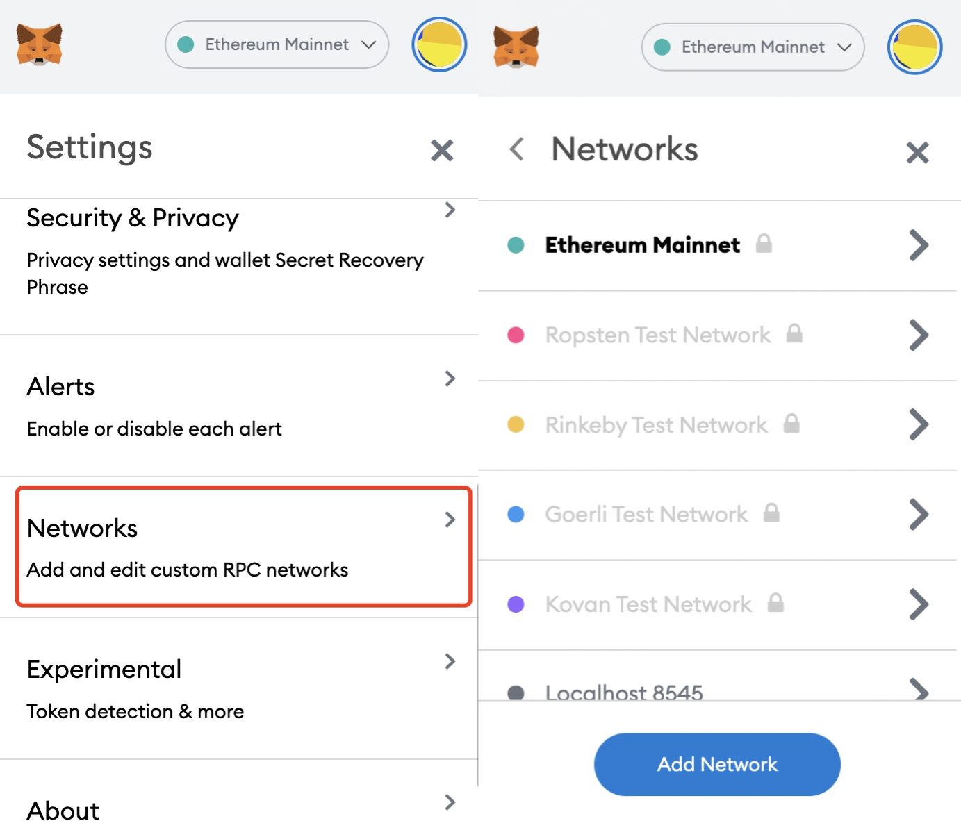 Step 2. Connect to Oasis Emerald. Click on the menu on the upper right and select the Settings button. In the Settings section, select the Networks button. Then click on the Add Network button to set the new network.
